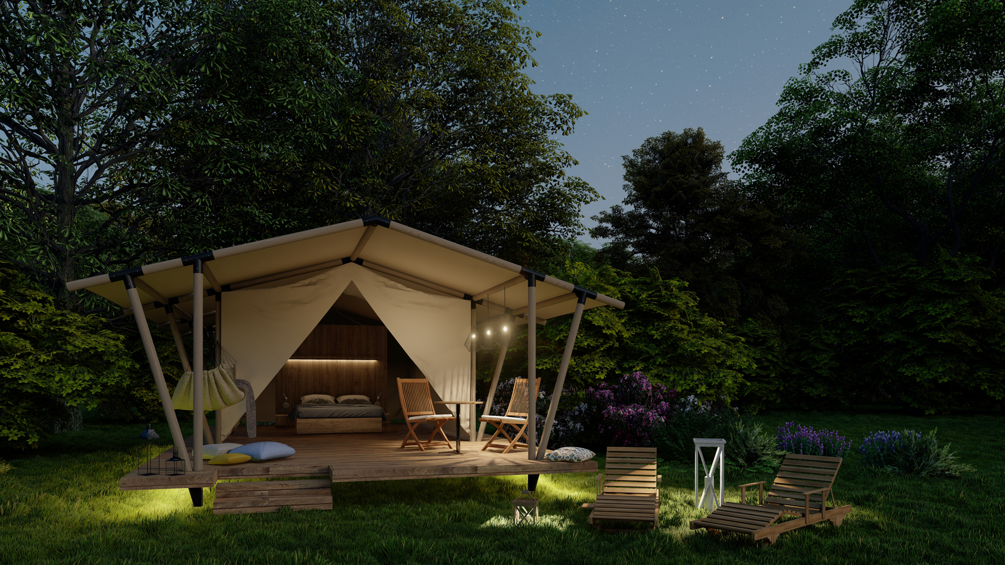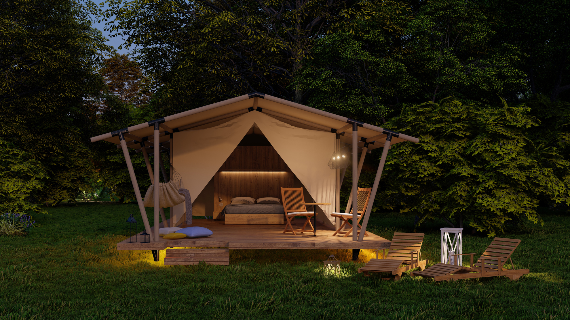 Il modello Hut è un glamping per alloggio temporaneo in legno e acciaio e telo.